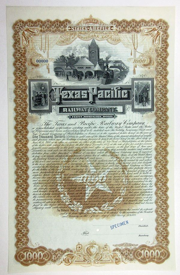 Louisiana & Texas. $1,000 Specimen 5% 1st Mortgage Bond, Black print on brown border and under tint, Large train station at top with figures standing buying tickets to left and right of title, Specimen overprints and POC's, VF-XF condition, HLBNC.