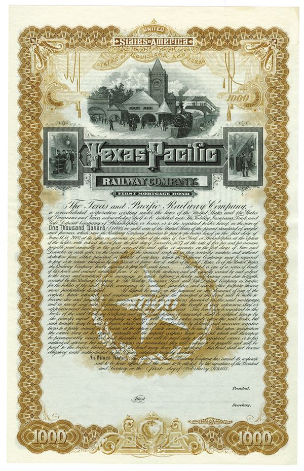 Louisiana and Texas, 1888, $1000, 1st Mortgage 5% Specimen Gold Bond, Vertical format, Black on light brown border and underprint, Locomotive at station top center passengers at ticket booth on left and passengers boarding train on right, Not stamped or cancelled, XF condition, HLBNC. Listed railway and previously unlisted bond in Cox.