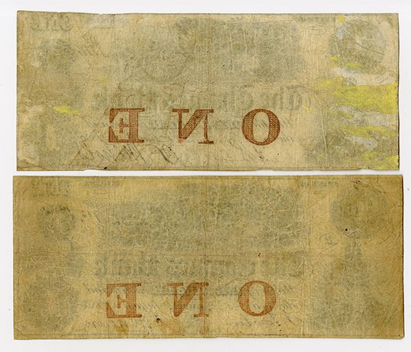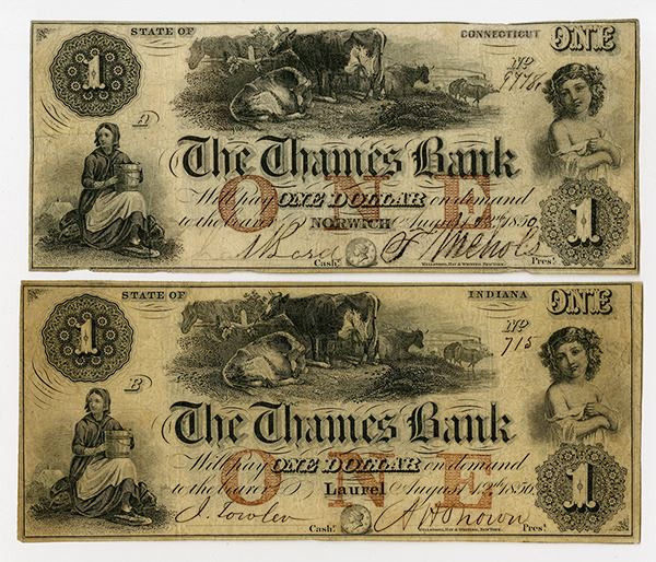 Norwich, CT. and Laurel, Indiana, Lot of 2 notes with the same design. The Thames Bank of Laurel, IN was fraudulent. The CT note was altered from the IN note. WH&W. Both contemporary Counterfeits. (2)