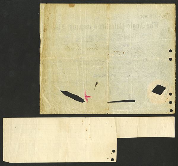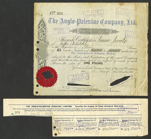 Palestine. 5 shrs = 1 Pound stock certificate. Issued and canceled. Multiple canceled hand stamps in Hebrew and English. Fine