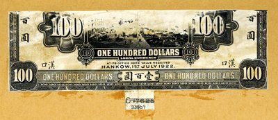 Hankow. China. 1922. P-S152A; S152B; S152C; S152D. $5; $10; $50; $100. 4 different proofs of bottom 1/2 of notes printed on india paper and mounted onto manila file cards. The impressions include the full denomination with the lower 1/2 of the vignette and entire bottom margin with text. All with minor glue stains or toning. All unique in this format. All the notes are unpriced in SCWPM and are extremely rare. You can own 1/2 of the set (Literally, the bottom 1/2) for less then 1/2 of the price. ABNC.