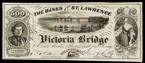 Canada, 1857, Obsolete look-alike Advertising Note with long bridge in middle with train coming out on right, Queen Victoria on right and Mr. Silver nail, Guide of Niagara Falls on left (Maybe he is related to Gold finger?), Black with no underprint, back is orange with text S.Zimmerman, Railway King and G.T. Railway, Over 800 Miles Long, with points of interest and hotels in different cities. Appears Choice Uncirculated at first glance, but there is a small stain on the upper right. Scarce and attractive in high grade.