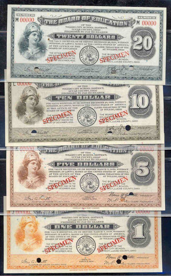 Toledo, Ohio.1933-34. $1; $5; $10; $20 4 different specimen banknotes. All have allegorical woman on left with helmet. The $1 and $5 are dated March 5, 1934 and the $10 and $20 are dated December 29, 1933. All have red specimen overprints, POC's and "00000" serial numbers. The $1 is orange, the $5 is brown, the $10 is black and the $20 is navy blue. The backs match the face color. Choice Unc. Rare specimen set. ABNC.