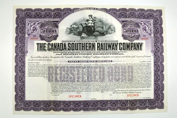 Canada. 1913. $50,000 Consolidated Guaranteed 50Year 5% Gold Bond Series A, purple frame, Allegorical female by shipyard/dock vignette, VF, ABNC.