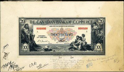 Toronto. Canada. 1917-18. P-S967 Unlisted. $20 Unique approval proof, on large white card, with additions and changes made to design including painting out a small black inner border with a white paint wash, adding red "00000" serial numbers and adding the lower printer copyright and date beneath the lower frame line. This note has different versions of the President and General Manager signatures than the final version that was issued. Multiple approval signatures on the bottom and dated "26/7/18". Notes on bottom of card request minor changes to design. Back of card has multiple different date stamps by ABNC, Ottawa. Pick lists this note dated 1917, but this approval proof seems to indicate that the note was first designed in 1918. Deserves further research. Unlisted as proof. Choice Unc.. ABNC, Canadian BNC.