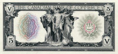 Toronto, Canada. 1917. P-S965 Unlisted. $5 Essay face proof without undertint, but with seals on left and right in grey-olive green, red, turquoise and lavender. Printed on india paper on large card. The note is also missing the bank note company imprint on bottom and "ABNCo" copyright on lower left. Unlisted as proof. Choice Unc.. Rare note. ABNC, Canadian BNC.