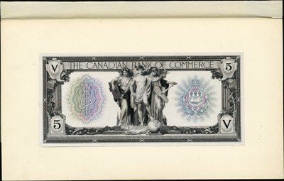 Toronto, Canada. 1917. P-S965 Unlisted. $5 Essay face proof without undertint, but with seals on left and right in grey-olive green, purple, turquoise and lavender. Printed on india paper on large card. The note is also missing the bank note company imprint on bottom and "ABNCo" copyright on lower left. Unlisted as proof. Choice Unc.. Rare note. ABNC, Canadian BNC.