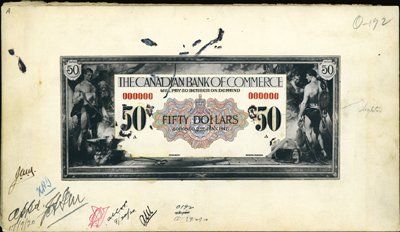 Toronto. Canada. 1917-20. P-S968 Unlisted. $50 Unique approval mockup or model on large white card, with small changes requested. Photo proof of frame with vignette pasted to card along with separate title, cycloid tint, denomination and red "00000" serial numbers. Multiple approval signatures on the bottom and dated "17/9/20". Back of card has multiple different date stamps by ABNC. Pick lists this note dated 1917, but this approval proof seems to indicate that the note was first designed in 1920. Deserves further research. Unlisted as proof. Stray ink markings on top border and onto note, otherwise Choice Unc.. ABNC.