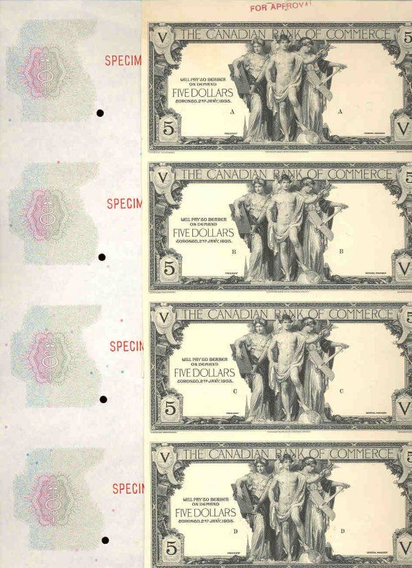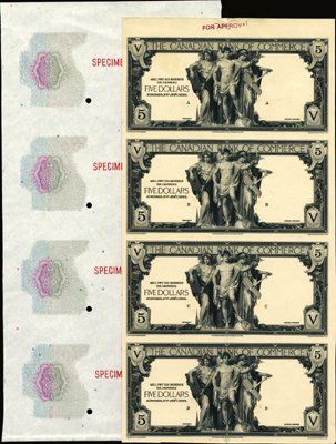 Toronto. Canada. 1935. P-S970 Unlisted. $5 Vertical strip of 4 of face proofs without undertint, printed on card. Each note has a different plate letter from "A to D". Top of sheet has "For Approval" handstamp on top. Also includes strip of 4 of cycloid undertints with green, red and blue undertint and red "Specimen" overprints. Unlisted as proof. All of the notes have been folded once vertically through the middle for archival storage. AU-Unc.. Rare format. Canadian BNC.