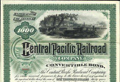 1885. $1,000. Specimen 6% bond. Green border. Locomotive passing cows, trees and river on top and patriotic eagle on bottom. XF condition. Red specimen overprints, POC's and "00000" serial numbers. Coupons attached. Extremely rare certificate. Unlisted color in Cox. ABNC.