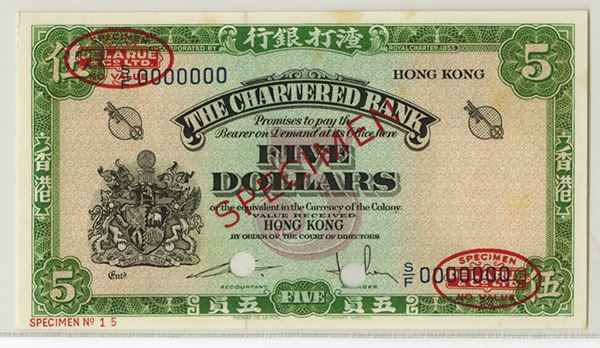Hong Kong. ND (1961), 5, P-68s, KNB44S, Specimen Banknote, Specimen and Oval TDLR overprints on top left and lower right corners, Minor Mounting remnants on back right margin that is difficult to view. PCGS graded Very Choice New 64, POC, TDLR.