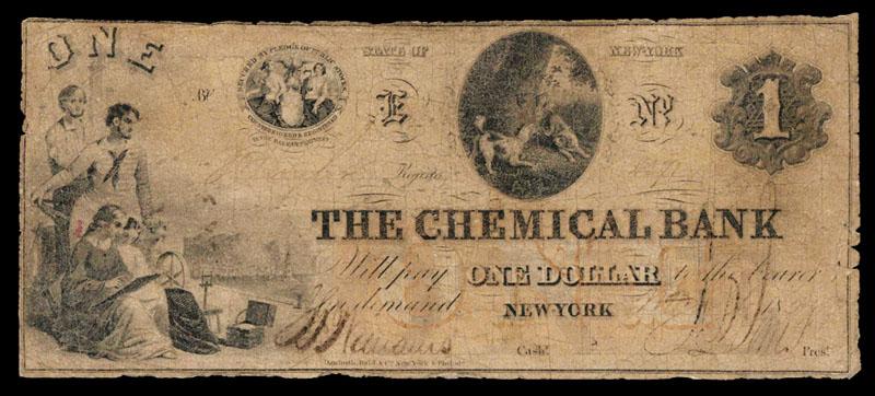The Chemical Bank Obsolete Banknote.New York, NY, Chemical Bank $1, NY-1505-G82b, Issued banknote, dogs chase birds on upper right middle, industrial scene with 2 men and woman with spinning wheel on left, faded orange undertint, DB with ABNCo monogram, VG condition, became the Chemical National Bank of New York. (Round Mountain Collection, Part 1).