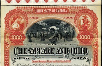 Virginia; West Virginia. 1892. $1,000. Specimen General Mortgage, 4-1/2% Gold Bond of 1892. Red border. Amazing multi-vignetted railroad bond. Speeding locomotive in circle on bottom middle; Ferry in harbor on lower right; Factory with small coal or ore train in front on the lower left; Workers at dock on upper left and blacksmith on upper right with fancy and ornate title.Ornate railroad staion vignette with luggage handlers and passengers bwetween 2 trains on top and track workers flanking railroad tracks on bottom. "Reaper" vignette on top left and male "reaper" on upper right. Red specimen overprints, POC's and "00000" serial numbers. XF condition. Rare and attractive bond. Listed railroad in Cox with 5 issued ones of this variety reported. ABNC.