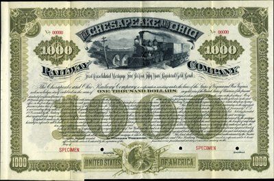 The Chesapeake and Ohio Railway Co. Bond. Va, WV. ca.1889. $1,000. Specimen First Consolidated Mortgage, 5%, 50 Year Registered Gold Bond. Olive green border. Locomotive over trestle with telegraph pole in front if it and Indian on bottom. Red specimen overprints, POC's and "00000" serial numbers. XF condition. Rare and attractive bond. Listed railroad in Cox, unlisted bond variety and date. ABNC.