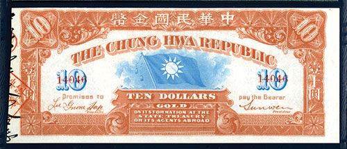 $10 Republic Gold Unit Currency Note, S/M #C262-2, (Chinese Catalog Vol.14, Page 6 and Vol.15, Page 87), Light chestnut brown border surround light blue flag on face, green border and flag on back. S/N 14046. Signed by Sun Wen “aka” Dr. Sun Yat-sen, PMG graded Choice About Uncirculated 58 EPQ with the note appearing CU, Rare military related banknote.