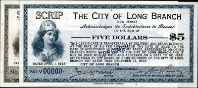 Long Branch, NJ. 1934. $1; $5 2 different specimen banknotes. Both have allegorical woman on left with helmet. Both have specimen overprints, POC's and "00000" serial numbers. The $1 is brown and the $5 is blue. Choice Unc. Rare as specimens. ABNC.