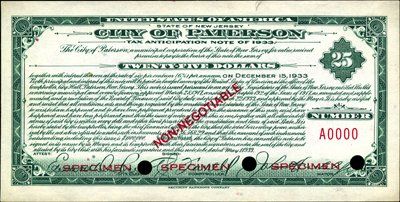 Paterson, NJ. 1933. $25 "Tax Anticipation Note of 1933". Specimen banknote. Red specimen overprints, POC's and "00000" serial numbers. Green. XF-AU with one diagonal vertical fold on left. SBNC.