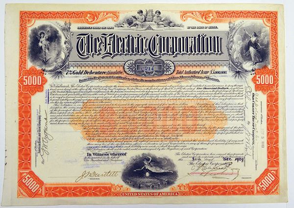 Maine, 1909. $5000 I/U 7% Registered Gold Cumulative Debenture Bond, Black text with orange border and undertint, at left and right are depictions of figures holding electrical wires in circular frames. VF condition, printed by ABNC. This bond was signed by Charles Francis Adams Jr, a member of the prominent Adams family. He served as a colonel in the Union Army during the Civil War, and went on to be an author, historian, and member of the Massachusetts Park Commission. He was the great-grandson of United States President John Adams and grandson of President John Quincy Adams.