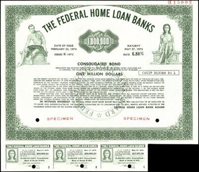 U.S. Government. 1974. Specimen. "Organized and Existing Pursuant to the Federal Home Loan Bank Act". 4 different U.S. Federal related bearer bonds. All are Series K - 1975, 6.80% Consolidated bonds. All have allegorical man on left and woman on right with undertint of "Federal Home Loan Bank Bond" in middle. 1) $10,000, red. 2) $25,000, blue; 3) $100,000, purple; 4) $1,000,000, green. In 1932 the U.S. Congress established the Federal Home Loan Bank System to fill the need for a stable source of funds for residential mortgages. The Great Depression had undermined the existing banking system and Americans who had recently purchased or wanted to purchase homes. The Federal Home Loan Banks are government-sponsored enterprises, federally chartered but privately capitalized and independently managed. The Federal Home Loan Bank System raises funds by issuing debt instruments (bonds and notes) in the capital markets and have "AAA" credit ratings. A Federally related Bond. Rare. Federated BNC. XF.