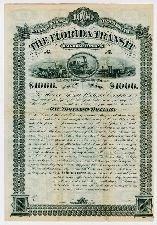 Florida. $1,000, bond, train l-r in oval, harbor scene beyond, vertical format, 1st mortgage, bearer gold coupon, 6%, 30-yr, 1881, due 1911, VF, by ABN.