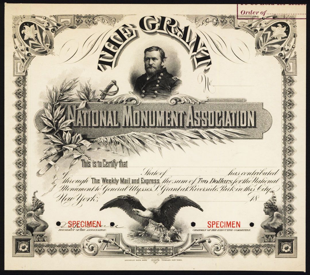 New York, NY 18xx, (ca.1880's), $2 Donation, Specimen Donation certificate, Grant portrait on top middle, patriotic screaming eagle with shield on bottom, ornate border, Specimen overprint, POC's, AU condition. ABNC.