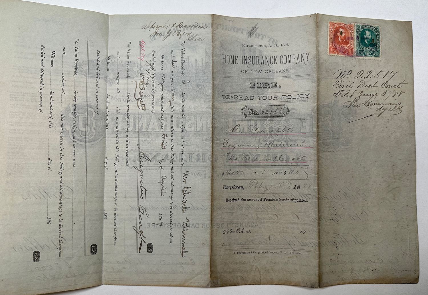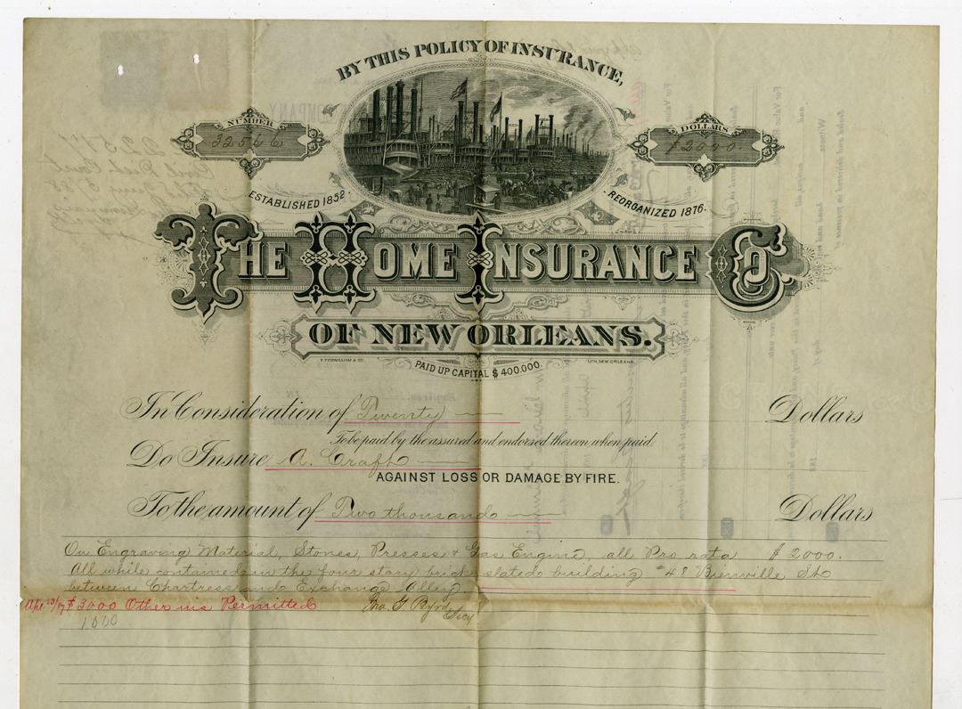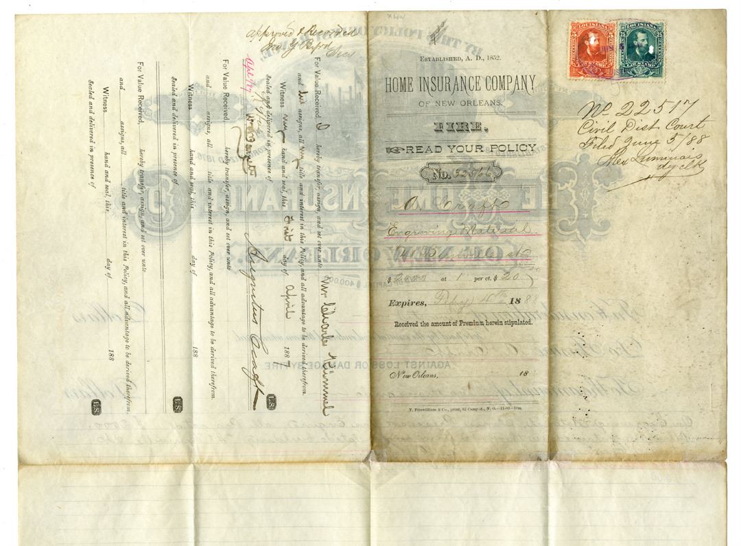 New Orleans, Louisiana. 1887, The Home Insurance Co., of New Orleans - Fire, Issued insurance policy to A. Craft for insuring his Engraving Materials, presses, and stones housed in a 4 story building at #48 Bienville St., New Orleans for $2000 that was increased to $3000 three months later. Ornate wharf and dock scene with multiple steamboats at top over ornate title. Back has 2 Louisiana Law stamps, one for 5 cts and the second for 25 cts, both with POCs. Overall VF to XF condition. Evidently this was a lithography and engraving company.