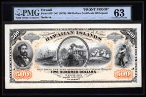 ND (1879). $500, Series A, P-5p., Face proof printed on large card cut down to banknote size with ample borders, black on light orange. Portrait of King Kalakua at left, locomotive flanked by steam and sailing ships in middle and farmer carrying produce at right. Back is blank with evidence of previous light mounting in middle with light tape mark. The note is in a PMG holder and grades "Choice Uncirculated 63". The ultimate banknote for the Hawaiian collector that is unpriced in SCWPM and rarely if ever offered. This note is missing from almost every advanced collection and has never been seen by most collectors and dealers. This is a historic opportunity to acquire the King of Hawaiian banknotes. ABNC.