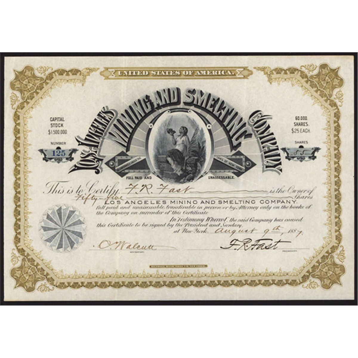 California, 1886. 55 Shares, Issued and uncancelled stock certificate, Black with brown border, Allegorical tropical woman with palm fronds and lamp with bananas at her feet under ornate and very attractive title, Cert.# 125, XF condition. Issued to and signed by F. R. Fast, President, Incorporated in NY. Scarce and attractive Western mining certificate. Kendall BNC, NY imprint.