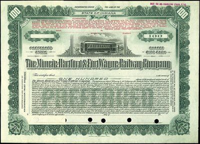 IN. 1906. Specimen. 100 shs, Capital Stock, green. Vignette of interurban electric streetcar. Unlisted railroad in Cox. SBNC. XF.