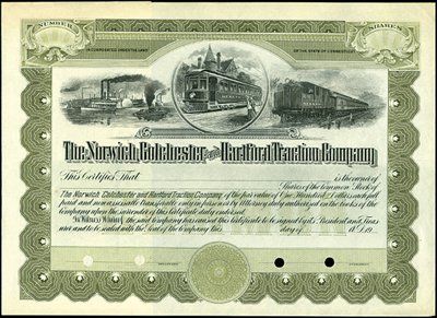 CT. 19--(ca. 1900-1920). Specimen. Odd shs, Common Stock, olive green. Vignette of interurban electric streetcar in middle, diesel on right and steamboat on left. Unlisted railroad in Cox. SBNC. XF.