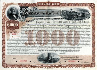Pennsylvania. 1888. $1,000. Specimen 5% Loan of $10,000,000 Secured by Consolidated Mortgage, "Rate reduced from 5% to 4%". "Asa Parker" on top left, train at station on top right and canal with barges on bottom. Brown border. Red specimen overprints, POC's and "00000" serial numbers. XF condition. No coupons. Rare and attractive bond. Listed as a proof bond only, not listed as a specimen. ABNC.