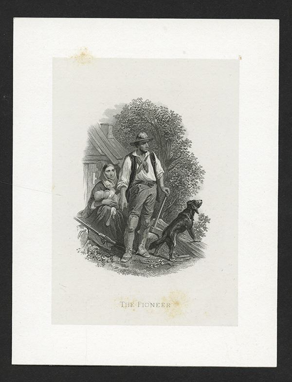 Woodchopper vignette (aka "The Pioneer"), Proof printed on india paper mounted on large card, Man standing with dog and family holding an ax, AU to Uncirculated with toning spots on the upper left and lower margin. Scarce and popular U.S. currency vignette. No imprint but possibly the BEP or ABNC.