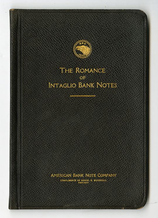New York, 1925. ABNC, Printed book about Paul Revere and the impact he has on banknotes, Leather hardcover, 2nd edition, Intaglio proof vignette of Paul Revere on inner front cover, Gold ABN logo on front cover with "Compliments of Daniel E. Woodhull, President" at the bottom. New, as printed condition, ABNC.