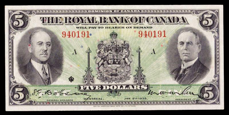 The Royal Bank of Canada, 1935.Montreal, Quebec, Canada, 1935, $5, S-1391, 6301802a, Issued banknote, green, Canadian Arms at center, Wilson at left and Holt on right, S/N 940191, Dobson - Wilson Large signature variety, PMG graded Very Fine 30 EPQ Exceptional Paper Quality. One light vertical fold from Choice VF condition with this note being as nice as possible and still remaining only a VF. BABNC.