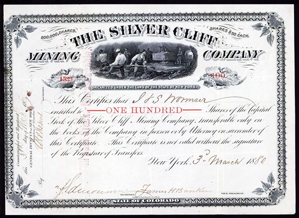 Colorado. 1880. Issued and uncancelled stock certificate. 100 Shares. Miners with ore cars. Black border. Fine condition with ink stains on left. ABNC.