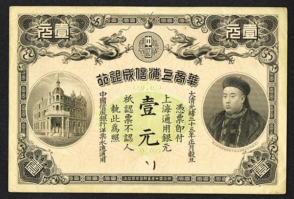 Shanghai, China, 1907, $1, Shanghai Currency, P-Unlisted, S/M-H186-1, Unissued banknote. Face is black on light peach and lime green underprint, Official looking notable on right, bank building one left, facing dragons on top with seal, back is red, peach and lime green with facing dragons on top with seal, ornate title, No Serial Numbers, the note appears Choice AU Condition with large even margins and fresh appearance but there is a lower right corner tip bend and 1 small pin hole and rust spot on the bottom middle that keeps this note from Uncirculated condition.