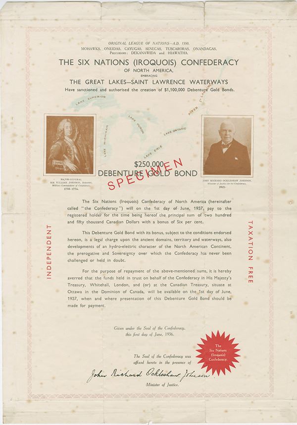 U.S. & Canada. 1936, $250,000 6% Debenture Gold Bond, Black text with brown photograph of John Richard Ockleshaw Johnson "Minister of Justice for the Confederacy, 1921-" on right "Major General Sir William Johnson, Baronet, Military Commander of the Confederacy, 1755-1774". Map of the great lakes in middle. The title " Original League of Nations - A.D. 1550. Mohawks, Oneidas, Cayugas, Seneca, Tuscarora's, The Six Nations Confederacy of North America Embracing The Great Lakes - Saint Lawrence Waterways. Facsimile signature of the president. First time seen by cataloger.