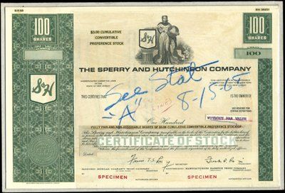 OH. 1968. 1) Unique Approval Model or mockup for "100 shs" of $3.00 Cumulative Preference Stock in green. Vignette of allegorical woman holding globe with arm resting on S&H logo. 2) Proof of the same certificate in purple on light brown paper. 3) Specimen of same certificate in green. 4) Miscellaneous correspondence. Unique archival production file of the famous "S&H" green stamp company. SCBNC. Choice group.