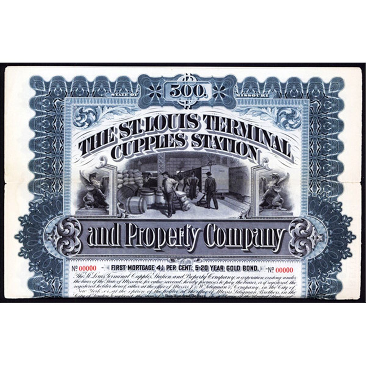 Missouri. 1897. $500. 1st Mortgage 4 1/2% Gold Bond. Slate blue border and undertint. Men unloading cargo from trains in middle flanked by Griffens on left and right. Fine condition with some slight fold splits. Coupons included but detached. Red specimen overprint and POC's. ABNC.
