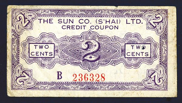 Shanghai, China, ND (ca.1920-30's), 2 cents, P-Unlisted, Purple on light brown, S/N 236328, VF condition. Scarce Shanghai Scrip issue.