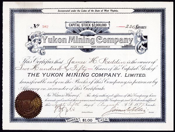 Alaska. 1897. 250 Shares. Capital Stock. Issued and uncancelled stock. Black border with ornate title. No vignette. XF condition. Rare and early certificate. Incorp. WV. Offices in Toronto. Issued right at the beginning of the Yukon Gold rush.