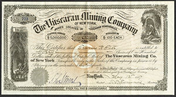 New York. 40 Shares Capitol Stock, Issued and Uncancelled Certificate. Black ink with ornate black border and pink under print. Vignette in upper right hand corner and left side shows men working in mines. under print shows an American Bald Eagle with rays emanating from it in an ombre pattern. XF, John H. Gresham Printers.
