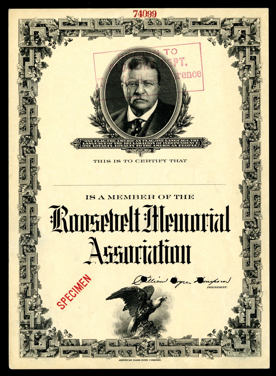 Washington, D.C., ND (ca.1910-20), Specimen Membership certificate with Portrait of President Roosevelt on top with screaming eagle at bottom, ornate border, red specimen and purple archival overprints on face, POC's, Order # 74099 on top margin back blank, XF-AU condition, Rare Specimen of this memorial certificate which has not been offered since the June 1991 "Christies - ABN Archives sale". (Ex. Dennis Luck collection). The only memorial to the 26th president of the United States in the nation’s capital is a small island in the Potomac River. An architectural memorial and the restored natural landscape surrounding it together form a living memorial to the man known as the “Great Conservationist.” Theodore Roosevelt was the first president to make conservation of America’s natural resources a centerpiece of his domestic policy. For him, wise stewardship of land and wildlife made present and future growth possible. Almost 230 million acres of land came under the protection of the Federal Government during his term in office. Architect Eric Gugler and sculptor Paul Manship created the architectural memorial, with its open plaza and larger than life sized statue. Landscape architect Frederick Law Olmsted, Jr., and his associate Henry Hubbard, created the plan that still guides maintenance of the memorial landscape.