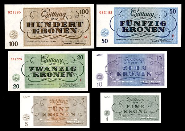 Theresienstadt Concentration Camp Money. 1943. Czechoslovakia. Complete set, 1, 5, 10, 20, 50 and 100 Kronen. All Very Choice Crisp Uncirculated. [7]