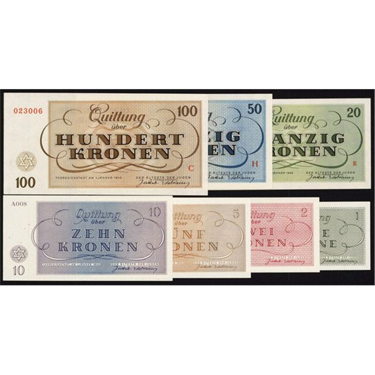 Theresienstadt, Czech Republic, 1943, Lot of 7 notes, 1 Krone to 100 Kronen, All are Choice Uncirculated. Presented by the Nazis as a model Jewish settlement, but in reality it was a concentration camp 'where over 33 000 inmates died as a result of hunger, sickness, or the sadistic treatment meted out by their captors.