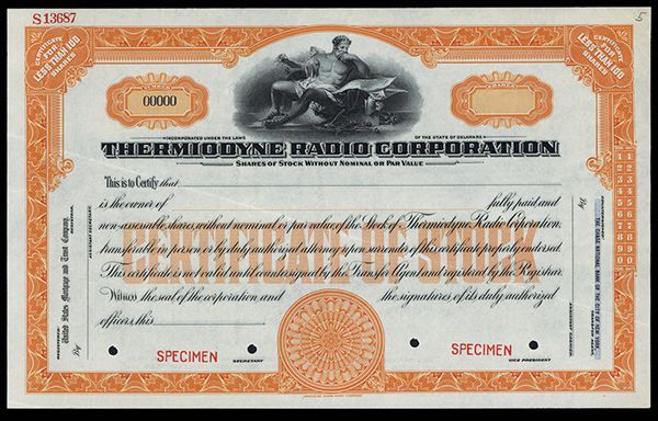 Thermiodyne Radio Corp. Specimen Stock. Delaware. Specimen Stock, Orange, classical male studies plans, ABNC. XF.