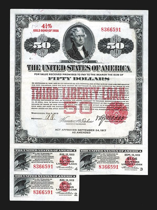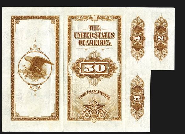 $50, Jefferson on top, ÒtemporaryÓ bond with ÒcherryÓ red color, highly embossed and retains three of the four original coupons. Unbeknown to most collectors, these temporary bonds are a subset of bonds that are amongst the scarcest; as once the 4th coupon came due they were exchanged at no cost to the ÒlongÓ bonds that resumed this series. The reverse in dark chocolate brown color features a classic American Bald Eagle and a strongly embossed Treasury Seal.