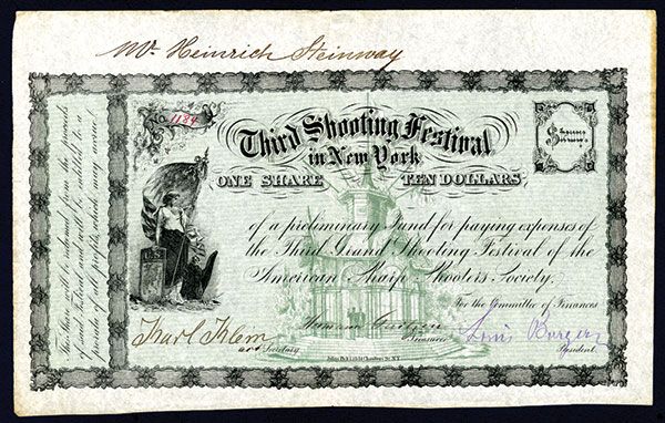 New York. 1 Share I/U Certificate. #1184. Black print with ornate black border and green underprint. Vignette in center of men at a building with lady to the left. VF condition. Julius Pick Lith. Funds raised are “for paying expenses of the Third Grand Shooting Festival of the American Sharp Shooters Society.” Attractive and rare certificate that would be a great gift for that special NRA member in your life or piano player.