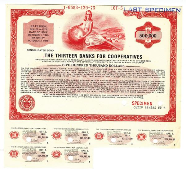 Washington, D.C.. 500,000 Specimen 8.55% Series A Consolidated Coupon Bond, Black print on red border and under tint in small sized certificate, Allegorical woman leaning on globe at top, Specimen overprints and POC's, VF-XF condition, ABNC.