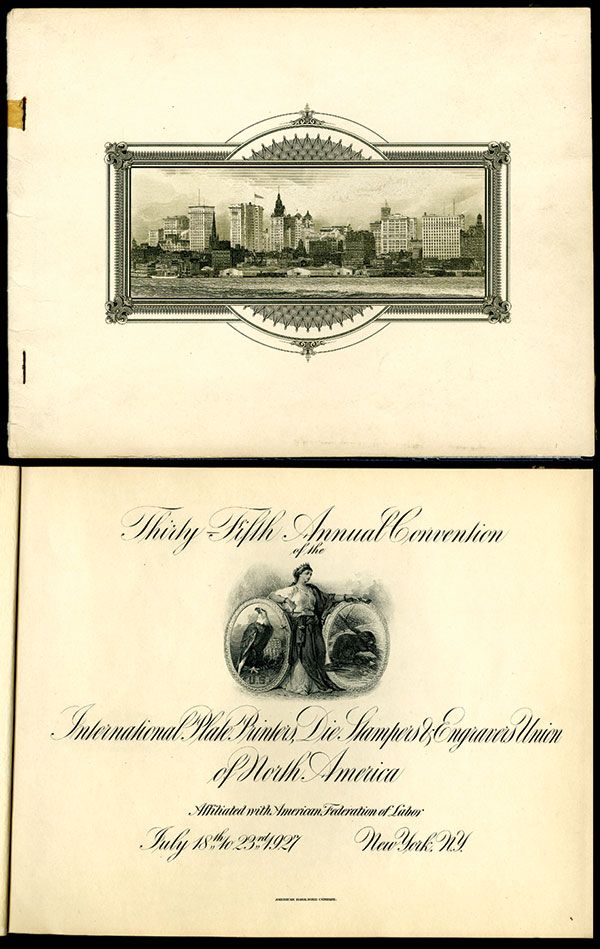New York, 1927, Complete booklet with the inner front page printed by ABNC with additional plates that are not engraved as well as numerous advertisements from printing business related companies. XF condition. Rare complete Convention booklet with ABNC plate.